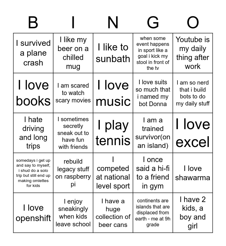 This bingo card has 75 words: I love spicy food, i love food, I like to sunbath, my fav holiday vacay is mexico, I like air travel, I love being with funny, I love yoga, I am a shopaholic, I love essential oils, I love binge watching netflix, I have 2 kids, a boy and girl, I take violin lessons, I love music, I love books, I hate drivers changing lane without a ight, I sometimes secretly sneak out to have fun with friends, I love sports, I play tennis, I like to take cruises, Youtube is my daily thing after work, I watch movies all day, I hate driving and long trips, I am scared to watch scary movies, I like my beer on a chilled mug, when some event happens in sport like a goal i kick my stool in front of the tv, I cook a lot, my kids cook more than mom, i love movies, I am always late to movies, I once did a winter sale selling a scary manaquin, I love to sip my coffee and read a book, I like to listen to music and walk, I love jogging in -20, I once said a hi-fi to a friend in gym, I am so nerd that i build bots to do my daily stuff, I love suits so much that i named my bot Donna, I love workout, I love to bake, I love excel, continents are islands that are displaced from earth - me at 9h grade, my dad is an engineer, engineers MUST do crossword puzzle, I have more computers than ppl, I have 2 cats, I dare someone here to watch tv 24hrs/365 with me, I love documentaries, I love openshift, I survived a plane crash, I did a solo trip in a canoe, I am an author, I live with siamese cats, I competed at national level sport, I travel a lot, than some of the porter airline pilots, I lived closer to a sport staidum, Enjoy F1, shawshank is my all time fav, I love vinyl records, Audio equipments are my passion, I love rock music, between beetle and mini I would take the beeetle and beat out the mini, rebuild legacy stuff on raspberry pi, i love to cylce, Photography with nature is my passion, I learn everyday, Camping is my thing, I am a trained survivor(on an island), I have patented comm devices selling in Walmart etc.,,(remember me next time you are at walmart), I played international board game championships, Visited diamond mines in canadas arctic(heloooo ppl they exist), I love shawarma, somedays i get up and say to myself, i shud do a solo trip but still end up making omlettes for kids, I enjoy sneakingly when kids leave school, I wish saturday had schools working, I have a huge collection of beer cans and I plat a tree every month.