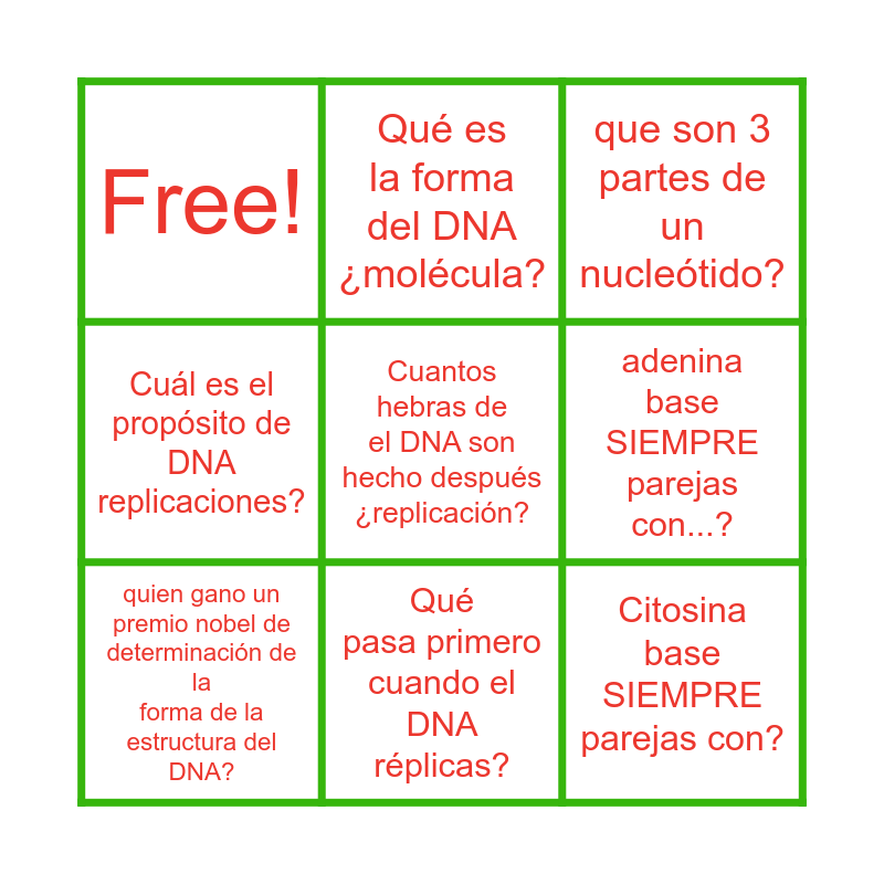 This bingo card has 9 words: quien gano un premio nobel de determinación de la forma de la estructura del DNA?, que son 3 partes de un nucleótido?, Qué es la forma del DNA ¿molécula?, Cuál es el propósito de DNA replicaciones?, Free!, adenina base SIEMPRE parejas con...?, Cuantos hebras de el DNA son hecho después ¿replicación?, Citosina base SIEMPRE parejas con? and Qué pasa primero cuando el DNA réplicas?.