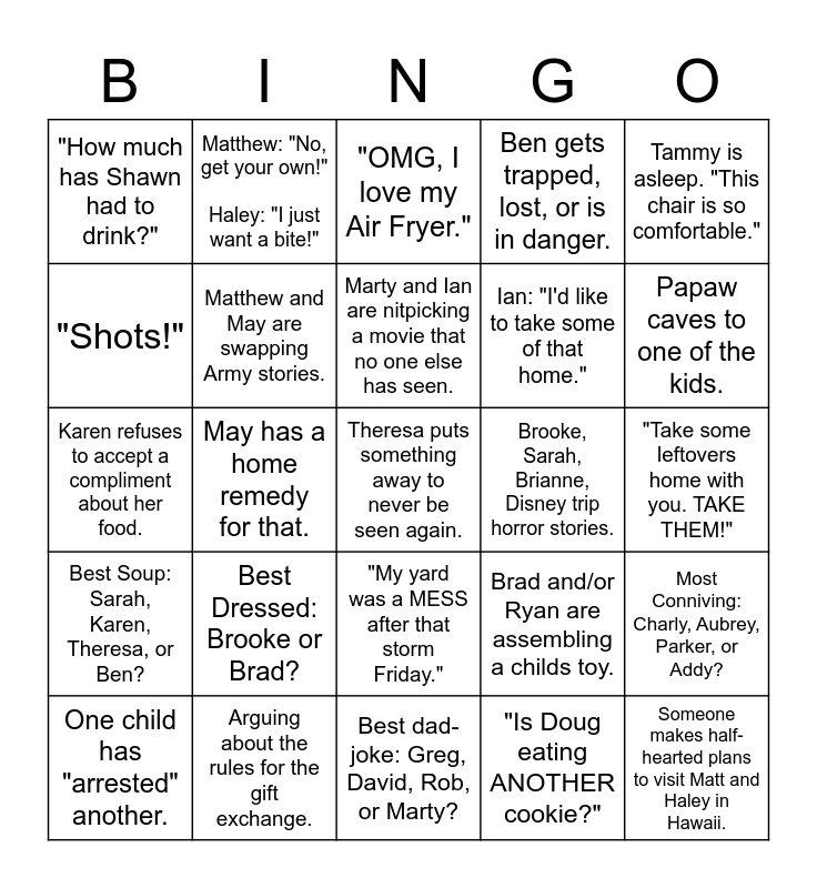 This bingo card has 25 words: Best Dressed: Brooke or Brad?, Best dad-joke: Greg, David, Rob, or Marty?, Marty and Ian are nitpicking a movie that no one else has seen., One child has "arrested" another., Tammy is asleep. "This chair is so comfortable.", "How much has Shawn had to drink?", "Shots!", Matthew: "No, get your own!" Haley: "I just want a bite!", Brooke, Sarah, Brianne, Disney trip horror stories., "My yard was a MESS after that storm Friday.", Ian: "I'd like to take some of that home.", Karen refuses to accept a compliment about her food., Brad and/or Ryan are assembling a childs toy., Most Conniving: Charly, Aubrey, Parker, or Addy?, Matthew and May are swapping Army stories., Someone makes half-hearted plans to visit Matt and Haley in Hawaii., "Take some leftovers home with you. TAKE THEM!", "OMG, I love my Air Fryer.", Papaw caves to one of the kids., May has a home remedy for that., Theresa puts something away to never be seen again., Arguing about the rules for the gift exchange., Best Soup: Sarah, Karen, Theresa, or Ben?, Ben gets trapped, lost, or is in danger. and "Is Doug eating ANOTHER cookie?".