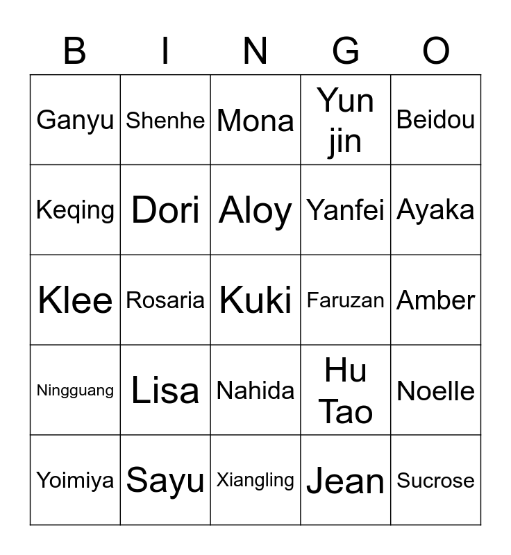 This bingo card has 41 words: Diona, Klee, Qiqi, Dori, Sayu, Nahida, Aloy, Xinyan, Beidou, Ningguang, Rosaria, Yun jin, Kuki, Amber, Faruzan, Lisa, Layla, Ganyu, Collei, Mona, Noelle, Sucrose, Xiangling, Yanfei, Candace, Kokomi, Jean, Fischl, Ayaka, Nilou, Sara, Shenhe, Yoimiya, Barbara, Hu Tao, Keqing, Yae, Raiden, Lumine, Eula and Yelan.