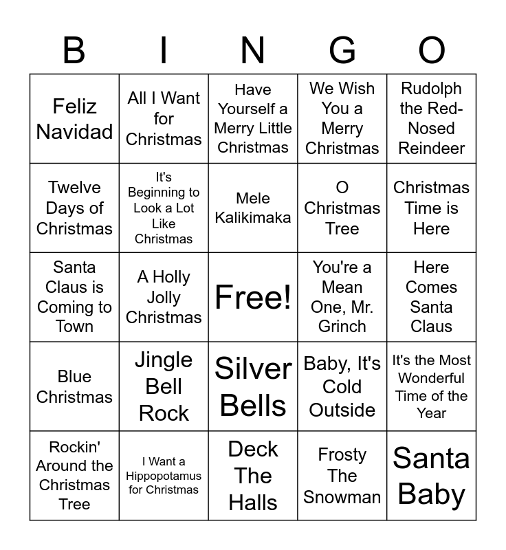 This bingo card has a free space and 29 words: Rockin' Around the Christmas Tree, Let It Snow!, A Holly Jolly Christmas, White Christmas, Feliz Navidad, Have Yourself a Merry Little Christmas, It's Beginning to Look a Lot Like Christmas, Jingle Bell Rock, You're a Mean One, Mr. Grinch, I Want a Hippopotamus for Christmas, Here Comes Santa Claus, Santa Baby, Deck The Halls, Frosty The Snowman, Christmas Time is Here, Do You Hear What I Hear?, Silver Bells, Blue Christmas, Rudolph the Red-Nosed Reindeer, Santa Claus is Coming to Town, Baby, It's Cold Outside, I Saw Mommy Kissing Santa Claus, O Christmas Tree, Twelve Days of Christmas, We Wish You a Merry Christmas, All I Want for Christmas, It's the Most Wonderful Time of the Year, Mele Kalikimaka and Run Rudolph Run.