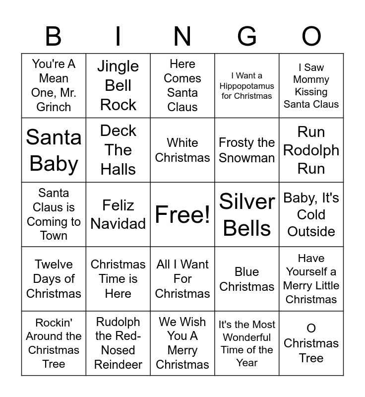 This bingo card has a free space and 29 words: Rockin' Around the Christmas Tree, A Holly Jolly Christmas, Feliz Navidad, It's Beginning to Look a Lot Like Christmas, You're A Mean One, Mr. Grinch, Here Comes Santa Claus, Deck The Halls, Christmas Time is Here, Silver Bells, Rudolph the Red-Nosed Reindeer, Baby, It's Cold Outside, O Christmas Tree, We Wish You A Merry Christmas, It's the Most Wonderful Time of the Year, Run Rodolph Run, Mele Kalikimaka, All I Want For Christmas, Twelve Days of Christmas, I Saw Mommy Kissing Santa Claus, Santa Claus is Coming to Town, Blue Christmas, Do You Hear What I Hear?, Frosty the Snowman, Santa Baby, I Want a Hippopotamus for Christmas, Jingle Bell Rock, Have Yourself a Merry Little Christmas, White Christmas and Let It Snow!.