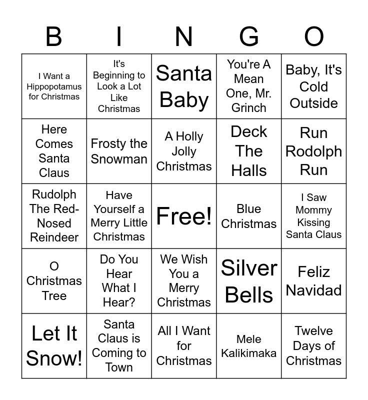 This bingo card has a free space and 29 words: Let It Snow!, White Christmas, Have Yourself a Merry Little Christmas, Jingle Bell Rock, I Want a Hippopotamus for Christmas, Santa Baby, Frosty the Snowman, Do You Hear What I Hear?, Blue Christmas, Santa Claus is Coming to Town, I Saw Mommy Kissing Santa Claus, Twelve Days of Christmas, All I Want for Christmas, Mele Kalikimaka, Run Rodolph Run, It's The Most Wonderful Time of the Year, We Wish You a Merry Christmas, O Christmas Tree, Baby, It's Cold Outside, Rudolph The Red-Nosed Reindeer, Silver Bells, Christmas Time Is Here, Deck The Halls, Here Comes Santa Claus, You're A Mean One, Mr. Grinch, It's Beginning to Look a Lot Like Christmas, Feliz Navidad, A Holly Jolly Christmas and Rockin' Around the Christmas Tree.