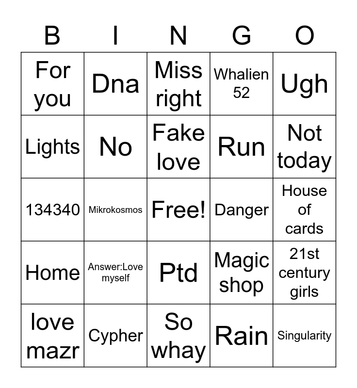 This bingo card has a free space and 24 words: Answer:Love myself, Cypher, Fake love, love mazr, Ugh, For you, Lights, Dna, Danger, Ptd, Run, 134340, Magic shop, 21st century girls, No, Rain, House of cards, Miss right, Not today, Mikrokosmos, Singularity, Home, Whalien 52 and So whay.
