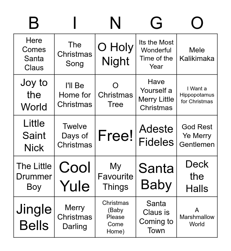 This bingo card has a free space and 71 words: Rockin' Around the Christmas Tree, The Christmas Song, Let it Snow! Let it Snow! Let it Snow!, A Holy Jolly Christmas, Christmas (Baby Please Come Home), White Christmas, Its the Most Wonderful Time of the Year, Feliz Navidad, Have Yourself a Merry Little Christmas, Its Beginning to Look alot Like Christmas, Jingle Bells, You're a Mean One, Mr. Grinch, I Want a Hippopotamus for Christmas, Here Comes Santa Claus, Winter Wonderland, Little Saint Nick, Santa Baby, Mele Kalikimaka, When a Child is Born, God Rest Ye Merry Gentlemen, Cool Yule, A Marshmallow World, Deck the Halls, The Man with the Bag, Christmas Time is Here, Frosty the Snowman, Caroling, Caroling, Please Come Home for Christmas, Blue Christmas, Do You Hear What I Hear?, Merry Christmas Darling, Happy Holiday, Silver Bells, Home for the Holidays, Santa Claus is Coming to Town, O Tannenbaum, Rudolph the Red-Nosed Reindeer, O Come All Ye Faithful, Joy to the World, Run Rudolph Run, My Favourite Things, The First Noel, The Little Drummer Boy, Mary's Boy Child, Linus and Lucy, O Little Town of Bethlehem, Baby, Its Cold Outside, I'll Be Home for Christmas, This Christmas, Mistletoe and Holly, What are You Doing New Year's Eve?, Silent Night, Adeste Fideles, The Happiest Christmas Tree, Here We Come a-Caroling, I Saw Mommy Kissing Santa Claus, O Christmas Tree, I've Got My Love to Keep Me Warm, What Child is This, All I Want for Christmas (Is My Two Front Teeth), The Christmas Waltz, 'Zat You, Santa Claus?, Twelve Days of Christmas, The Nutcracker, Hark the Herald Angels Sing, We Three Kings, O Holy Night, The Christmas List, Christmas Dream, Santa Claus is Coming to Town and We Wish You a Merry Christmas.