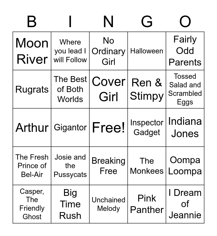 This bingo card has a free space and 40 words: The Addams Family, Arthur, The Ballad of Gilligan's Island, The Best of Both Worlds, Big Time Rush, Breaking Free, Cover Girl, Do-Re-MI, Fairly Odd Parents, The Fresh Prince of Bel-Air, Gigantor, Halloween, I Dream of Jeannie, Indiana Jones, Inspector Gadget, Josie and the Pussycats, Lady Marmalade, Moon River, My Favorite Things, No Ordinary Girl, Oompa Loompa, Pink Panther, Ren & Stimpy, Rugrats, Saved by the Bell, Seinfeld, Short skirt/Long Jacket, Singin' In the Rain, Star Wars, Stayin Alive, Teenage Mutant Ninja Turtles, Casper, The Friendly Ghost, The Dukes of Hazzard, The Monkees, Tossed Salad and Scrambled Eggs, Unchained Melody, Welcome Back, When Will my Life Begin?, Where you lead I will Follow and Won't You be my Neighbor?.