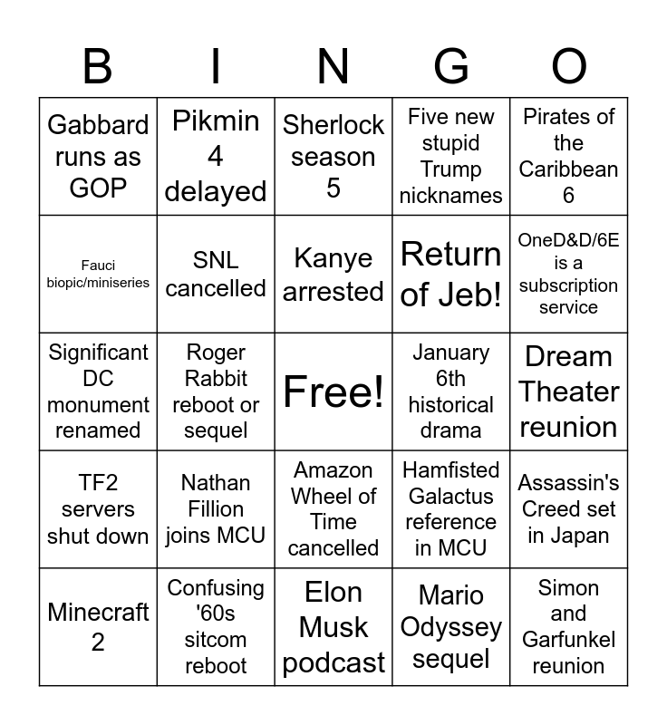 This bingo card has a free space and 25 words: Nathan Fillion joins MCU, Elon Musk podcast, Kanye arrested, Minecraft 2, Pirates of the Caribbean 6, Gabbard runs as GOP, Fauci biopic/miniseries, Pikmin 4 delayed, January 6th historical drama, Amazon Wheel of Time cancelled, Return of Jeb!, Significant DC monument renamed, Hamfisted Galactus reference in MCU, Assassin's Creed set in Japan, SNL cancelled, Vine returns, Dream Theater reunion, Sherlock season 5, OneD&D/6E is a subscription service, Roger Rabbit reboot or sequel, Simon and Garfunkel reunion, Confusing '60s sitcom reboot, TF2 servers shut down, Five new stupid Trump nicknames and Mario Odyssey sequel.