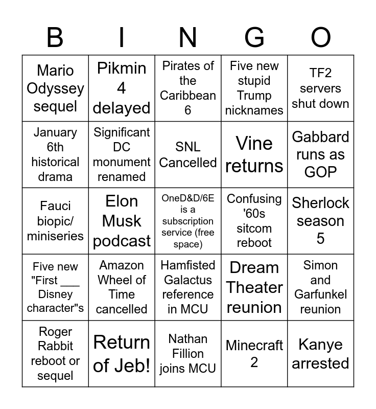 This bingo card has a free space and 24 words: Roger Rabbit reboot or sequel, Amazon Wheel of Time cancelled, SNL Cancelled, Minecraft 2, TF2 servers shut down, Mario Odyssey sequel, Pikmin 4 delayed, Pirates of the Caribbean 6, Confusing '60s sitcom reboot, Sherlock season 5, Fauci biopic/ miniseries, Significant DC monument renamed, Dream Theater reunion, Simon and Garfunkel reunion, January 6th historical drama, Return of Jeb!, Nathan Fillion joins MCU, Five new stupid Trump nicknames, Gabbard runs as GOP, Five new "First ___ Disney character"s, Elon Musk podcast, Hamfisted Galactus reference in MCU, Vine returns and Kanye arrested.