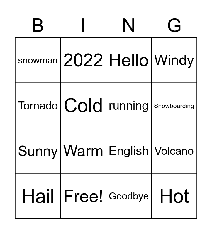 This bingo card has 21 words: Free!, Christmas, 2022, surfing, Goodbye, running, snowman, Hello, English, Snowboarding, Sunny, Windy, Hot, Snowy, Cold, Rainy, Hail, Warm, Tornado, Volcano and Swim.