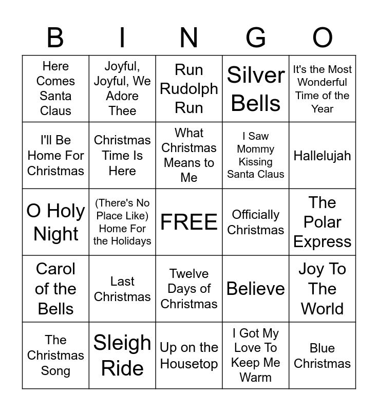 This bingo card has a free space and 24 words: Last Christmas, Sleigh Ride, What Christmas Means to Me, The Christmas Song, It's the Most Wonderful Time of the Year, Here Comes Santa Claus, I'll Be Home For Christmas, Joyful, Joyful, We Adore Thee, Officially Christmas, Twelve Days of Christmas, I Saw Mommy Kissing Santa Claus, O Holy Night, Believe, Joy To The World, Christmas Time Is Here, I Got My Love To Keep Me Warm, The Polar Express, Run Rudolph Run, Hallelujah, (There's No Place Like) Home For the Holidays, Blue Christmas, Carol of the Bells, Silver Bells and Up on the Housetop.
