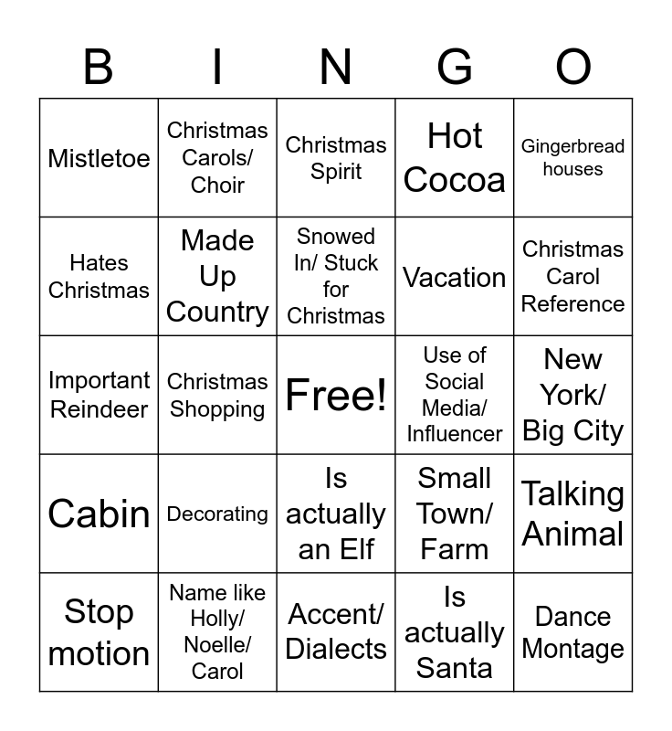 This bingo card has a free space and 26 words: Is actually an Elf, Is actually Santa, Snowed In/ Stuck for Christmas, Name like Holly/ Noelle/ Carol, Gingerbread houses, Mistletoe, Hates Christmas, Christmas Carols/ Choir, New York/ Big City, Small Town/ Farm, Vacation, Important Reindeer, Talking Animal, Stop motion, Christmas Shopping, Snow Man/ Snow Angels/ Snow globe, Hot Cocoa, Cabin, Christmas Spirit, Dance Montage, Christmas Carol Reference, Accent/ Dialects, Use of Social Media/ Influencer, Decorating, Made Up Country and Christmas Pun.
