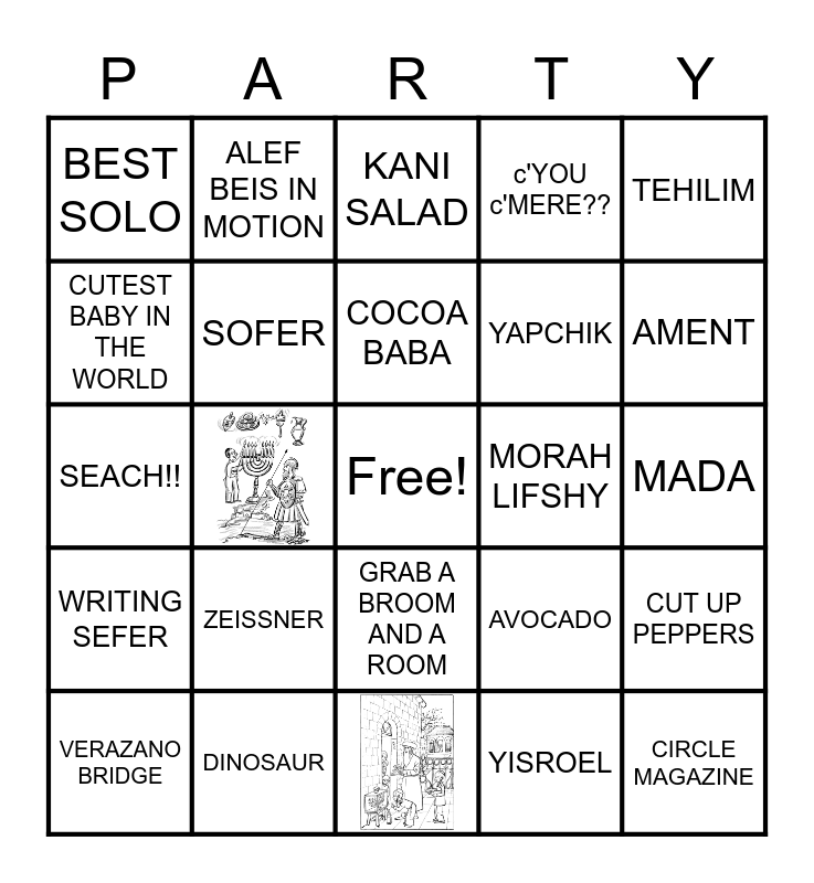 This bingo card has 2 images, a free space and 22 words: ZEISSNER, DINOSAUR, COCOA BABA, VERAZANO BRIDGE, TEHILIM, BEST SOLO, CUTEST BABY IN THE WORLD, ALEF BEIS IN MOTION, MORAH LIFSHY, GRAB A BROOM AND A ROOM, YAPCHIK, SEACH!!, AVOCADO, CUT UP PEPPERS, SOFER, YISROEL, MADA, KANI SALAD, AMENT, CIRCLE MAGAZINE, WRITING SEFER and c'YOU c'MERE??.