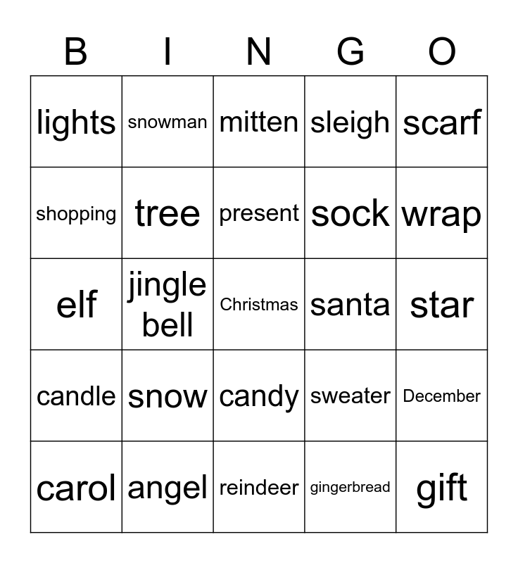 This bingo card has a free space and 24 words: snow, angel, present, carol, scarf, lights, shopping, snowman, santa, candy, sock, elf, sweater, December, tree, gingerbread, star, mitten, wrap, jingle bell, gift, candle, sleigh and reindeer.