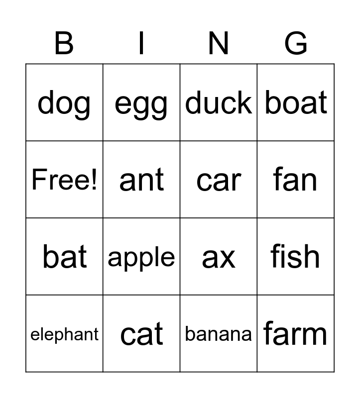 This bingo card has 16 words: cat, fish, duck, dog, bat, egg, ax, banana, Free!, ant, elephant, boat, apple, fan, car and farm.