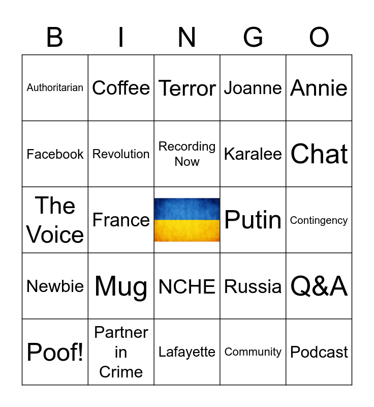 This bingo card has a free space and 31 words: Lafayette, Zelensky, France, Washington, Authoritarian, Terror, Revolution, Russia, Putin, Community, Contingency, Podcast, Links, Rules of the Game, Chat, Bingo, Q&A, Mug, Newbie, NCHE, Annie, Week/Episode count, Poof!, Coffee, Karalee, Facebook, Joanne, The Voice, Partner in Crime, Recording Now and After Party.