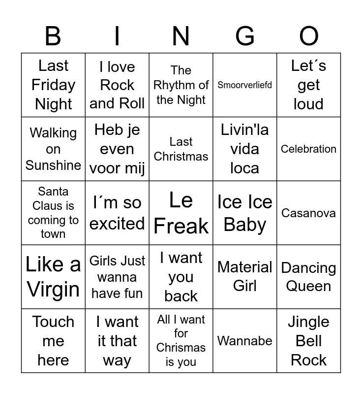 This bingo card has 55 words: Rosanne, Touch me here, I will survive, Last Friday Night, All I want for Chrismas is you, Crazy in Love, Heb je even voor mij, Never gonna give you up, Livin'la vida loca, Don´t stop till you get enough, Smoorverliefd, Respect, Everywhere, Wake me up before you go go, Stayin´ Alive, Blame it on the boogie, Let´s get loud, I´m so excited, U can´t touch this, Le Freak, Ice Ice Baby, Red Red Wine, Material Girl, The Rhythm of the Night, Night Fever, Last Christmas, Wannabe, I wanna dance with Somebody, Casanova, Dancing Queen, Lekkerding, Gimme! Gimme! Gimme! (A man after Midnight), Man I feel like a Woman, Murder on the Dancefloor, Walking on Sunshine, Santa Claus is coming to town, Upside down, Like a Virgin, Jingle Bell Rock, You´re the one that I want, I love Rock and Roll, Hey Ya!, Kiss, Just can't get enough, Girls Just wanna have fun, I want it that way, Single Ladies, Leef, Conga!, Celebration, Happy, Het is een nacht, Where do you go, I want you back and Father Christmas.