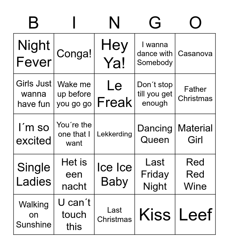This bingo card has 55 words: All I want for Chrismas is you, Walking on Sunshine, The Rhythm of the Night, Night Fever, Last Christmas, Man I feel like a Woman, Wake me up before you go go, Jingle Bell Rock, Don´t stop till you get enough, Like a Virgin, I wanna dance with Somebody, Upside down, Smoorverliefd, I love Rock and Roll, Wannabe, Murder on the Dancefloor, Casanova, You´re the one that I want, Stayin´ Alive, Lekkerding, Dancing Queen, Santa Claus is coming to town, Last Friday Night, Hey Ya!, Gimme! Gimme! Gimme! (A man after Midnight), Le Freak, Kiss, Crazy in Love, Material Girl, Red Red Wine, I want it that way, Never gonna give you up, Let´s get loud, Touch me here, Girls Just wanna have fun, I´m so excited, Just can't get enough, Single Ladies, Leef, Celebration, Conga!, Heb je even voor mij, Blame it on the boogie, Livin'la vida loca, Het is een nacht, U can´t touch this, Happy, Where do you go, Everywhere, Father Christmas, I want you back, Respect, I will survive, Ice Ice Baby and Rosanne.