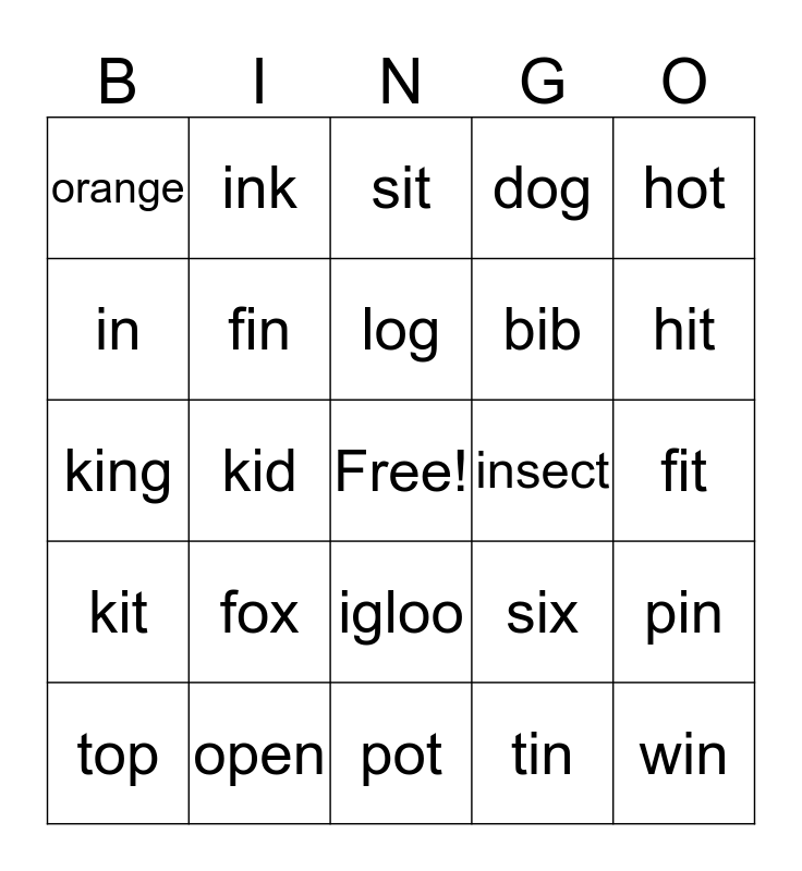 This bingo card has a free space and 24 words: fox, open, log, top, hot, orange, in, ink, insect, igloo, bib, king, six, pin, fin, tin, fit, sit, hit, kid, win, kit, dog and pot.