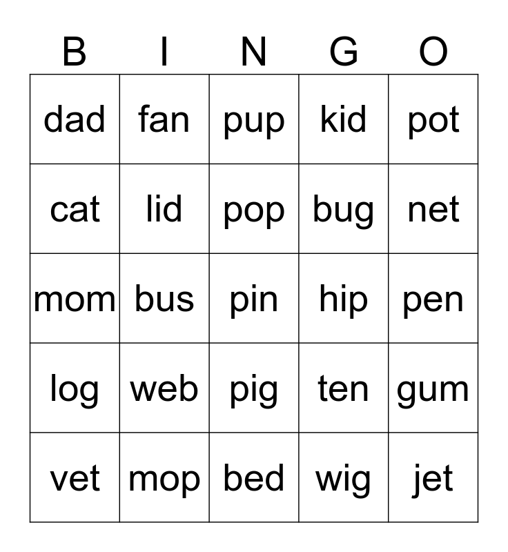 This bingo card has a free space and 24 words: web, mop, pop, vet, pot, dad, cat, fan, hip, pig, bug, mom, ten, gum, lid, wig, pen, pup, net, bus, jet, log, kid and bed.