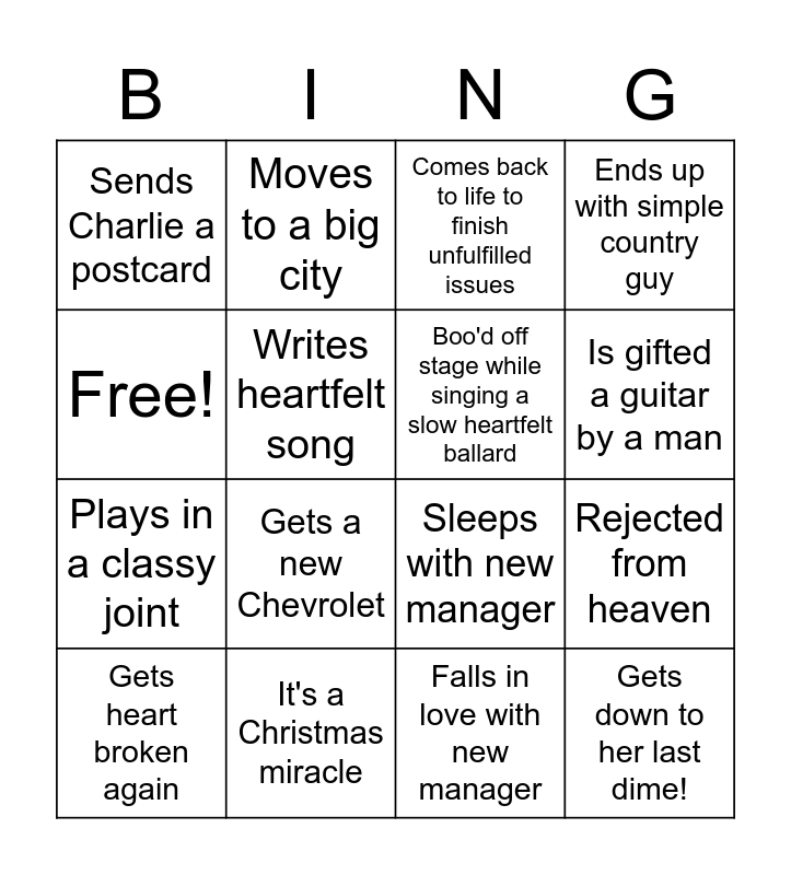 This bingo card has 16 words: It's a Christmas miracle, Rejected from heaven, Comes back to life to finish unfulfilled issues, Sends Charlie a postcard, Plays in a classy joint, Moves to a big city, Sleeps with new manager, Falls in love with new manager, Free!, Writes heartfelt song, Gets heart broken again, Ends up with simple country guy, Gets a new Chevrolet, Is gifted a guitar by a man, Boo'd off stage while singing a slow heartfelt ballard and Gets down to her last dime!.