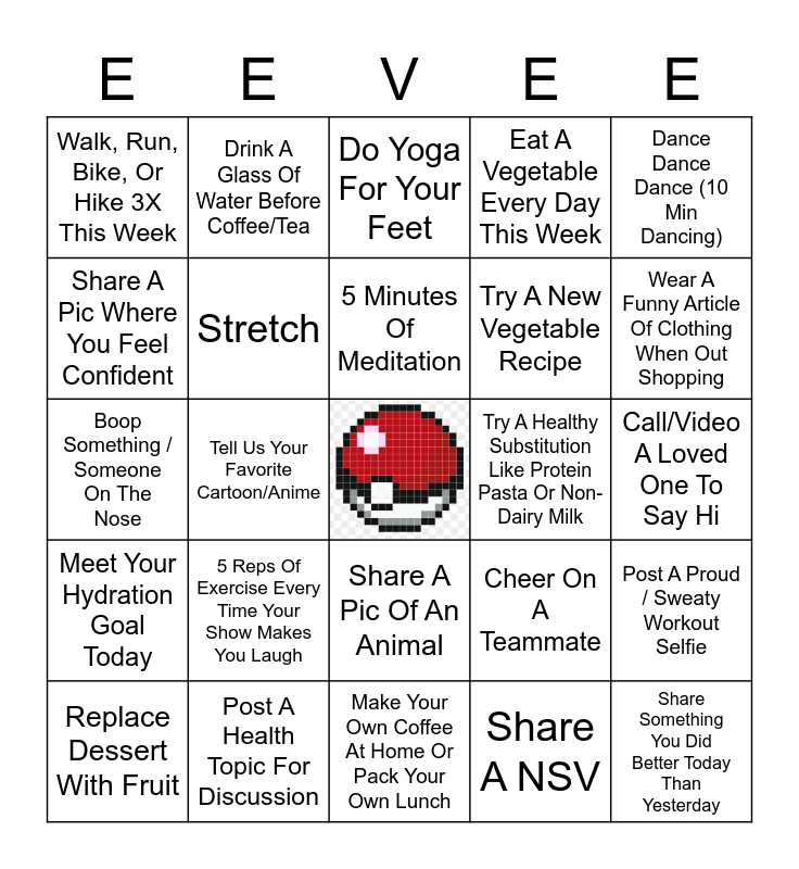 This bingo card has a free space and 223 words: (Safely) Push Past Your Workout Limit! When It Gets Hard, Don't Give Up!, 50 Squats In A Day, Dance Dance Dance (10 Min Dancing), Dance To Your Favourite Song, Dance To The Oldies While Wearing A Headband, Do 10 Reps/Mins Of An Exercise You Find Challenging, Do 10 Reps/Mins Of An Exercise You Hate, Do 10 Reps/Mins Of An Exercise You Love, Do Something Active Even If Sore, Do Yoga For Your Feet, Double Your Step Goal One Day, Early Bird (Am Workout), Exercise Outside, Exercise To An 80'S Hit, Exercise To A 90'S Hit, Exercise Wearing Something Silly, Exercise When You Don'T Want To, Explore A New Trail Or Park, Go For A Personal Record/Best, Go For A Walk, Go For A Walk And Pick Up Trash Along The Way, Hit Your Activity Goal, Hit Your Step Goal, Include Water In Your Exercise (Swim, Kayak, Etc.), Include Wheels In Your Exercise (Skate, Bike, Etc.), Night Owl (PM) Workout, Plank For As Long As You Can, Set A Personal Record For Wall Sit Or Plank, Stretch, Stretch 5/7 Days This Week, Stretch After Your Workout For At Least 5 Minutes, Stretch Post Workout Everyday This Week, Stretch Twice As Much As Usual This Week, Stretch Whatever Muscle Feels Tight, Tackle An Exercise/Trail That'S Been Intimidating You, Try A New Kind Of Workout, Try A New Strength Workout, Try A New Workout App, Try A New Workout Video On Youtube, Try A New Cardio Workout, Try Yoga or a new Yoga Pose Post a picture for +1 free space, Walk More Steps Than Yesterday, Walk, Run, Bike, Or Hike 3X This Week, Walk, Run, Bike, Or Hike A New Path, Work Out With A Friend, 5 Reps Of Exercise Every Time Your Show Makes You Laugh, Brainstorm Ideas For Loseit Challenge Themes, Call A Friend While Out For A Walk, Catch Up With A Friend (Virtual, Phone, Socially Distanced, etc.), Challenge A Teammate To A Plank-Off, Check In With Discord About Your Progress, Cheer On A Teammate, Do A Dare From A Teammate (Ask Someone To Dare You - No Unsafe Dares), Give A Team Captain Feedback, Learn And Share A Bug / Animal / Plant Fact, Post A Health Topic For Discussion, Post Something You'Re Excited For This Week, Post A Proud / Sweaty Workout Selfie, Post Your Favorite At-Home Workout, Post Your Favorite Childhood Recipe, Post Your Favorite Workout Outfit, Send Someone A Handwritten Letter Or Card, Share A Bingo Square Idea, Share An Autumn Memory, Share A Drawing of Your Favorite Pokémon!, Share A Funny Or Happy Song, Share A Meme, Share A Pic Of An Animal, Share A Pic Of Something Cool In Nature, Share A Pic Of Something You'Re Excited To Do/Wear Once You Hit Your Goal Weight, Share A "Woke Up Like This" Selfie, Share A Pic You Took While Out Walking, Share A Pic Where You Feel Confident, Share A Science Fact, Share A Self Care Idea, Share A Struggle You Have Overcome On Your Weight Loss Journey, Share A Video That Made You Laugh, Share A Weird Nsv, Share A Workout Video/Health Channel You Enjoy, Share A "Guilty Pleasure" Song You Love, Share A Pic Of Your Fitness Tracker Tan Line, Share A NSV, Share Other Ways To Cope With Stress Than Eating, Share Some Rewards You Are Working Towards, Share Something You Did Better Today Than Yesterday, Share What Brought You To Challenges, Share Your Amp Up Song Of The Week, Share Your Favorite Piece Of Workout Equipment, Share Your Goals For Today In The Accountability Channel, Share Your Why, Show Us A Cartwheel, Support A Local Farmer / Grower / Community Supported Agriculture, Support A Small Business. No Purchase Necessary, Leave A Review, Share A Post, Etc., Team Up With Someone For Accountability For Your Goals Today, Team Up With Someone To Make Sure You'Re Both Hitting Your Water Goal, Tell Us About One Of Your Hobbies, Tell Us Your Favorite Cartoon/Anime, Tell Us Your Favorite Wild Animal, Tell Us Your Favorite Pokemon, Walk With A Friend, Wave At 5 People During Your Run/Walk, Ask A Question In Discord, Don't Eat Out For 5 Consecutive Days, Meet Food Goals For A Week, Keep Up Your Weigh In Streak, Log Activity For The Challenge, Log Steps For The Challenge, Log Weight For The Challenge, Post A Screenshot Of Your Calories For 5 Days, Post A Goal For The Month, Commit To Updating Us Weekly On Progress, Prelog Your Food For The Day Every Morning, Record Your Activity For A Day, Record Your Food For A Day, Set A Small Version Of A Bigger Daily Goal And Meet The Mini Goal 5 Days Straight, Take Measurements, Take Progress Pics, Share your dream Pokémon fusion combo, Write Down Goals For The Day, Post a Form Check Video, Make A List Of Reasons Why You Want To Lose The Weight! Share A Few, 2 Fruit 5 Veg In One Day, 3 Days Of Meal Prep, Cook At Home For 3 Meals, Eat A Vegetable Every Day This Week, Eat Slowly: Take Over 20 Min To Finish A Meal, Feed A Friend Or Family Member A Healthy Meal, Share A Food Logging Streak, Drink A Glass Of Water Before Coffee/Tea, Drink Your Smoothie From The Fanciest Glass, Healthy Taco Night, Hydration Goal Streak 3 Days, Make Your Own Coffee At Home Or Pack Your Own Lunch, Meal Plan For The Week, Meatless Monday, Meet Your Hydration Goal Today, No Added Sugar For A Day, No Snacks Day, No Soda For A Week, No Sweets For A Week, Try A Smaller Portion Of Something You Know You Overindulge On, Replace Dessert With Fruit, Retry A Food You Dislike, Share Your Favorite Soup Recipe, Try A 16:8 Fast Or One Less Snack Item, Try A Different Protein Source, Try A Healthy Substitution Like Protein Pasta Or Non-Dairy Milk, Try A New Fruit Or Veggie, Try A New Healthy Snack, Try A New Healthy Recipe Or Food, Try A New Local Restaurant / Takeout / Delivery, Try A New Vegetable Recipe, Try Cooking A New Kind Of Cuisine, Try Cooking With A New Ingredient, Vegan Day, Vegetarian Day, Weigh Out A Portion Of A Dish, Make Or Share A Pinterest Food Board, 1 Week Of Gratitude (Sharing Optional), 5 Minutes Of Meditation, 5 Minutes Of Meditation 2 Times This Week, 10 Minutes Of Meditation, 10 Minutes Of Meditation 2 Times This Week, 15 Minutes Of Meditat