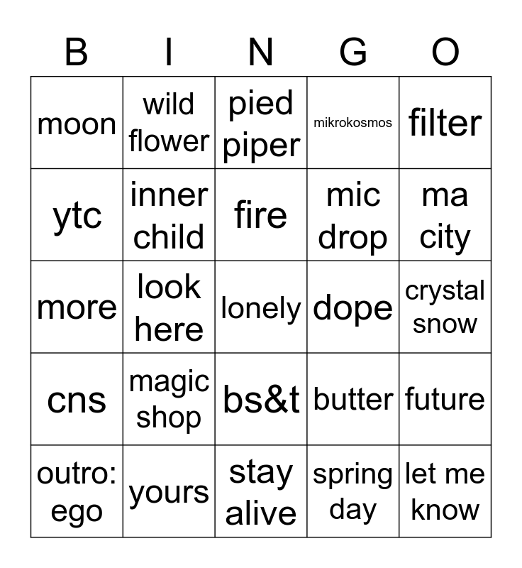 This bingo card has 25 words: magic shop, stay alive, fire, outro: ego, filter, moon, ytc, wild flower, dope, bs&t, mic drop, more, butter, future, inner child, let me know, crystal snow, pied piper, ma city, look here, lonely, yours, cns, mikrokosmos and spring day.
