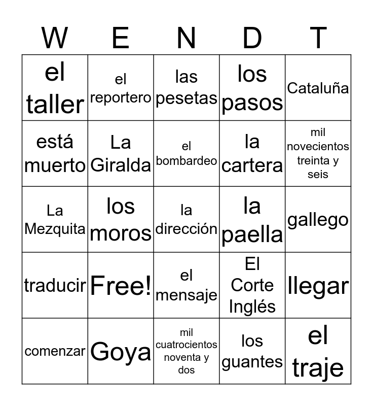 This bingo card has 25 words: Free!, mil cuatrocientos noventa y dos, el bombardeo, comenzar, Cataluña, el taller, está muerto, el reportero, la paella, el mensaje, la cartera, La Mezquita, El Corte Inglés, llegar, La Giralda, el traje, gallego, las pesetas, mil novecientos treinta y seis, los moros, la dirección, Goya, traducir, los pasos and los guantes.