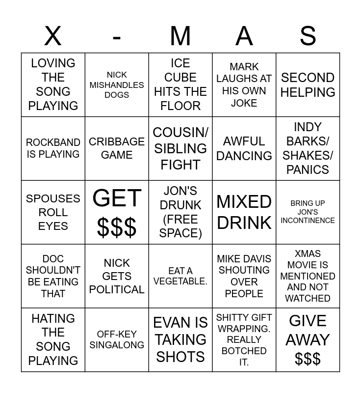 This bingo card has a free space and 36 words: BEER, CARD GAME, DOG FIGHT, CRIBBAGE GAME, MIKE DAVIS SHOUTING OVER PEOPLE, DOC SHOULDN'T BE EATING THAT, COUSIN/ SIBLING FIGHT, GET ASKED ABOUT COLLEGE/ WORK, SECOND HELPING, NOSTALGIC ANECDOTAL STORY SHARED, GET $$$, MARK LAUGHS AT HIS OWN JOKE, SPILLED DRINK, MIXED DRINK, INDY BARKS/ SHAKES/ PANICS, LOVING THE SONG PLAYING, EAT A COOKIE, NICK GETS POLITICAL, GIVE AWAY $$$, ICE CUBE HITS THE FLOOR, BRING UP JON'S INCONTINENCE, XMAS MOVIE IS MENTIONED AND NOT WATCHED, OFF-KEY SINGALONG, HATING THE SONG PLAYING, EVAN IS TAKING SHOTS, NICK MISHANDLES DOGS, SPOUSES ROLL EYES, REMARKING ON THE BAD WEATHER, AWFUL DANCING, ROCKBAND IS PLAYING, XMAS MOVIE/ SHOW EPISODE PLAYS, MORE TALENTED RELATIVES ARE DISCUSSED, SHITTY GIFT WRAPPING. REALLY BOTCHED IT., EAT A VEGETABLE., MEME COMPLAINS ABOUT FLAVOR and SOMEONE IS SCREWED OVER IN THE EXCHANGE.
