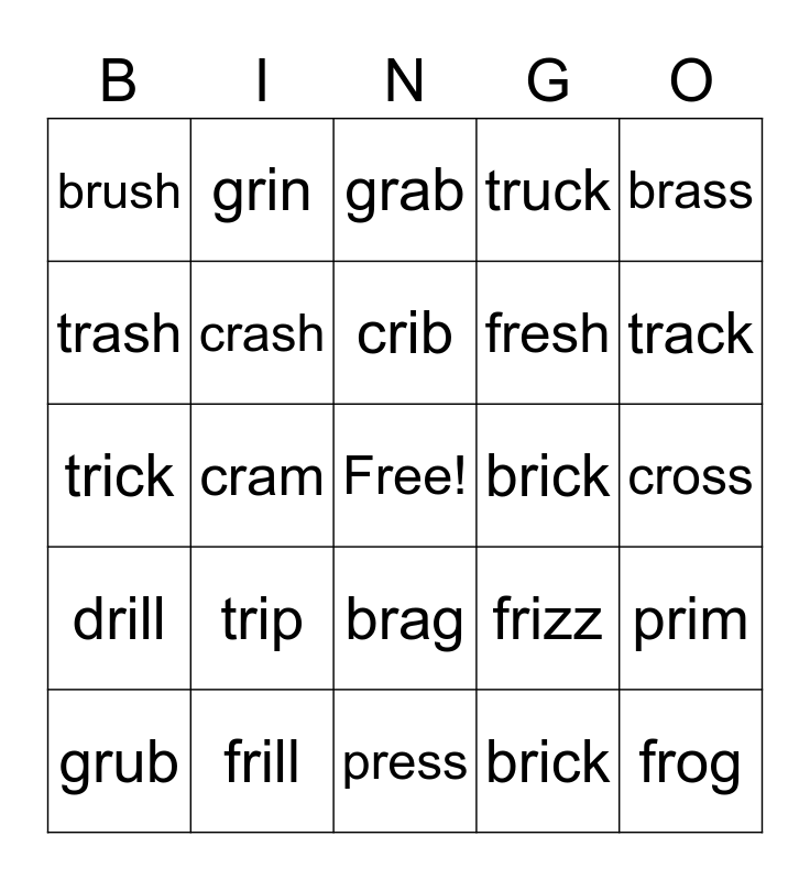 This bingo card has a free space and 24 words: trip, frill, crib, grub, brass, brush, trash, grin, brick, brag, fresh, trick, frizz, prim, crash, brick, cross, grab, track, cram, frog, drill, truck and press.