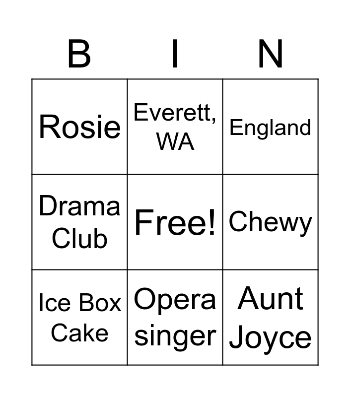 This bingo card has a free space and 10 words: Opera singer, England, Rosie, Aunt Joyce, Drama Club, Ice Box Cake, Everett, WA, Tap dancing, Chewy and Joe Biden.
