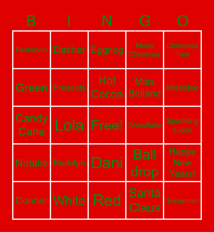 This bingo card has a free space and 24 words: Donner, Rudolph, Hot Cocoa, Santa Claus, Christmas Tree, Pentatonix, Dasher, Eggnog, Snowflake, Sparkling Cider, Candy Cane, Presents, Ball drop, Happy New Years!, Green, White, Red, Merry Christmas, Mistletoe, Natalie, Lola, Dani, Miss Bolland and Snowman.
