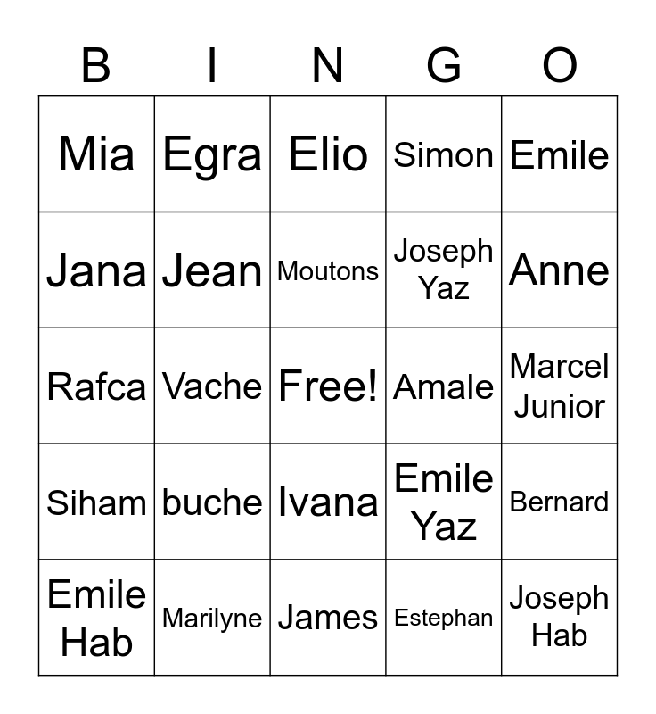 This bingo card has a free space and 54 words: Marcel, Siham, Marina, India, Ivana, Sim, Simon, Nana, Jana, Jeffrey, Mia, Kate, Marilyne, Emile Hab, Joe, James, Joseph Hab, Joseph Yaz, Katia, Marcel Junior, Emile Yaz, Celine, Amale, Emile, Gaga, Egra, Eliane, Jimmy, Khalo Zouzou, Estephan, Wehbe, Rita, Anthony, Rawane, Elio, Samia, Rafca, Bernard, Jano, Jean, Ralph, Marc, Joy, Star, buche, Dark chocolate, Noel, Bergers, Moutons, Vache, Anne, Mages, Ange and Herode.