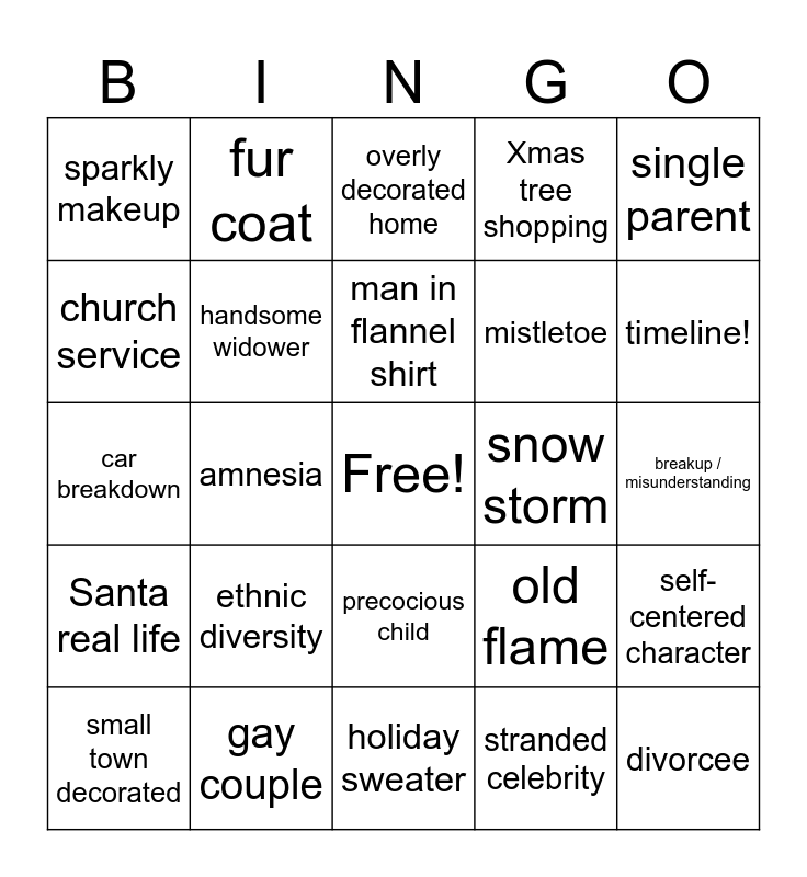 This bingo card has a free space and 24 words: ethnic diversity, gay couple, man in flannel shirt, small town decorated, single parent, sparkly makeup, church service, fur coat, snow storm, precocious child, mistletoe, car breakdown, old flame, self-centered character, handsome widower, stranded celebrity, breakup / misunderstanding, overly decorated home, timeline!, amnesia, divorcee, Santa real life, Xmas tree shopping and holiday sweater.