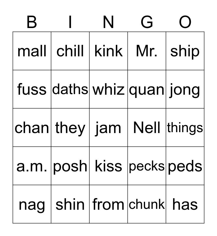 This bingo card has a free space and 24 words: posh, shin, whiz, nag, ship, mall, fuss, chill, Nell, kiss, quan, chan, pecks, peds, daths, chunk, things, kink, jong, they, has, a.m., Mr. and from.