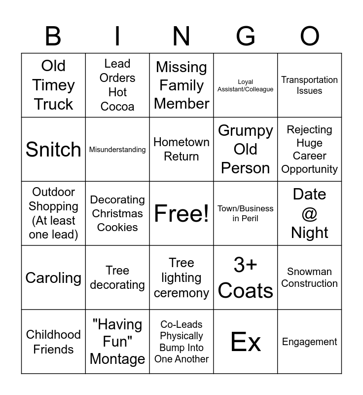 This bingo card has a free space and 32 words: Ex, Roasted Chestnuts, Decorating Christmas Cookies, Ginger Bread House Construction, Caroling, Misunderstanding, Transportation Issues, Snowman Construction, Lead Orders Hot Cocoa, Snowball fight (Two or more Snowballs), Hometown Return, Missing Family Member, Fake Dating, Sad Kid, Town/Business in Peril, Career in Peril, Childhood Friends, Outdoor Shopping (At least one lead), Tree lighting ceremony, Tree decorating, 3+ Coats, Holiday Related Contest, Date @ Night, "Having Fun" Montage, Engagement, Loyal Assistant/Colleague, Grumpy Old Person, Snitch, Old Timey Truck, Co-Leads Physically Bump Into One Another, Loved One Heart to Heart and Rejecting Huge Career Opportunity.