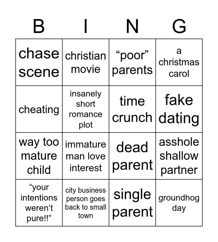 This bingo card has 21 words: city business person goes back to small town, literal evil protagonist, christian movie, ex boyfriend, single parent, time crunch, chase scene, “poor” parents, dead parent, fake dating, way too mature child, a christmas carol, groundhog day, secret angel/santa, insanely short romance plot, amnesia, “your intentions weren’t pure!!”, immature man love interest, cheating, asshole shallow partner and entire town decked out for christmas.