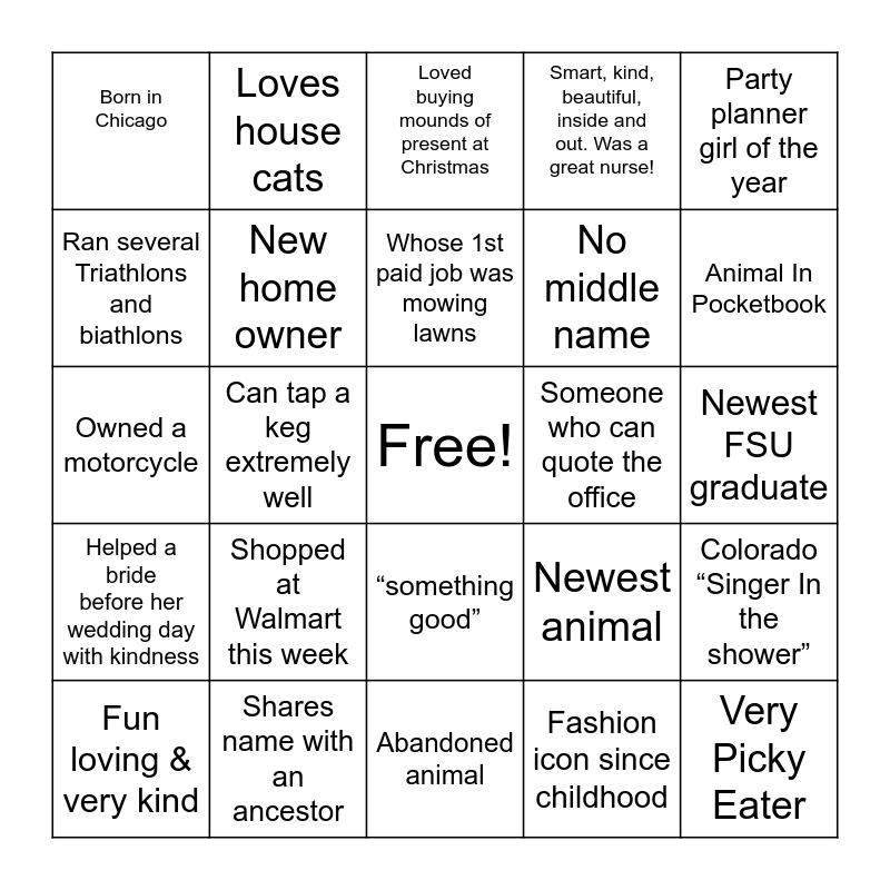 This bingo card has a free space and 24 words: Shopped at Walmart this week, Shares name with an ancestor, Whose 1st paid job was mowing lawns, Fun loving & very kind, Party planner girl of the year, Born in Chicago, Ran several Triathlons and biathlons, Loves house cats, Someone who can quote the office, “something good”, No middle name, Owned a motorcycle, Newest animal, Colorado “Singer In the shower”, New home owner, Fashion icon since childhood, Newest FSU graduate, Loved buying mounds of present at Christmas, Animal In Pocketbook, Can tap a keg extremely well, Very Picky Eater, Helped a bride before her wedding day with kindness, Smart, kind, beautiful, inside and out. Was a great nurse! and Abandoned animal.