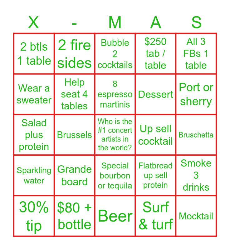This bingo card has a free space and 24 words: Grande board, $80 + bottle, 8 espresso martinis, 30% tip, All 3 FBs 1 table, 2 btls 1 table, Wear a sweater, 2 fire sides, Up sell cocktail, Special bourbon or tequila, Dessert, Salad plus protein, Flatbread up sell protein, Smoke 3 drinks, Help seat 4 tables, Surf & turf, Bruschetta, Bubble 2 cocktails, Port or sherry, Brussels, Mocktail, Sparkling water, $250 tab / table and Beer.