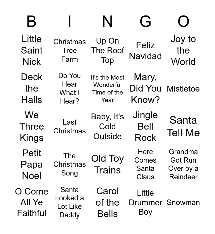 This bingo card has 47 words: All I Want for Christmas Is You, Baby, It's Cold Outside, Blue Christmas, Carol of the Bells, The Christmas Song, Christmas Tree, Christmas Tree Farm, Dance Of the Sugar Plum Fairy, Deck the Halls, Do They Know It's Christmas?, Do You Hear What I Hear?, Feliz Navidad, Grandma Got Run Over by a Reindeer, Here Comes Santa Claus, Holly Jolly Christmas, I Saw Mommy Kissing Santa Claus, It's the Most Wonderful Time of the Year, Jingle Bell Rock, Jingle Bells, Joy to the World, Last Christmas, Little Drummer Boy, Little Saint Nick, Mary, Did You Know?, Mary's Boy Child, Mistletoe, O Come All Ye Faithful, Oh Christmas Tree, Old Toy Trains, Petit Papa Noel, Rocking Around the Christmas Tree, Rudolph The Red Nose Reindeer, Run Rudolph Run, Santa Baby, Santa Claus is Comin' to Town, Santa Looked a Lot Like Daddy, Santa Tell Me, Silent Night, Silver Bells, Sleigh Ride, Snowman, Up On The Roof Top, We Three Kings, Where Are You Christmas?, Winter Wonderland, You Make It Feel Like Christmas and You're a Mean One Mr. Grinch.