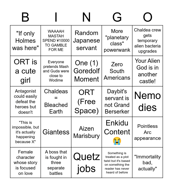 This bingo card has a free space and 24 words: Giantess, A boss that is fought in three separate battles, One (1) Goredolf Moment, Female character whose story is focused on love, Chaldea crew gets temporary alien bacteria upgrades, "If only Holmes was here", ORT is a cute girl, WAAAAH MASTAH SPEND ¥10000 TO GAMBLE FOR ME, Daybit's servant is not Grand Berserker, Aizen Marisbury, Zero South Americans, Antagonist could easily defeat the heroes but doesn't, Enkidu Content 😭, Pointless Arc appearance, Everyone pretends Mash and Guda were close to Wodime, Something is treated as a plot twist but it's based on something the reader has never heard of before, Nemo dies, Random Japanese servant, Your Alien God is in another castle!, Chaldeas = Bleached Earth, "Immortality bad, actually", "This is impossible, but it's actually happening because X", More "planetary class" powerwank and Quetz jobs.