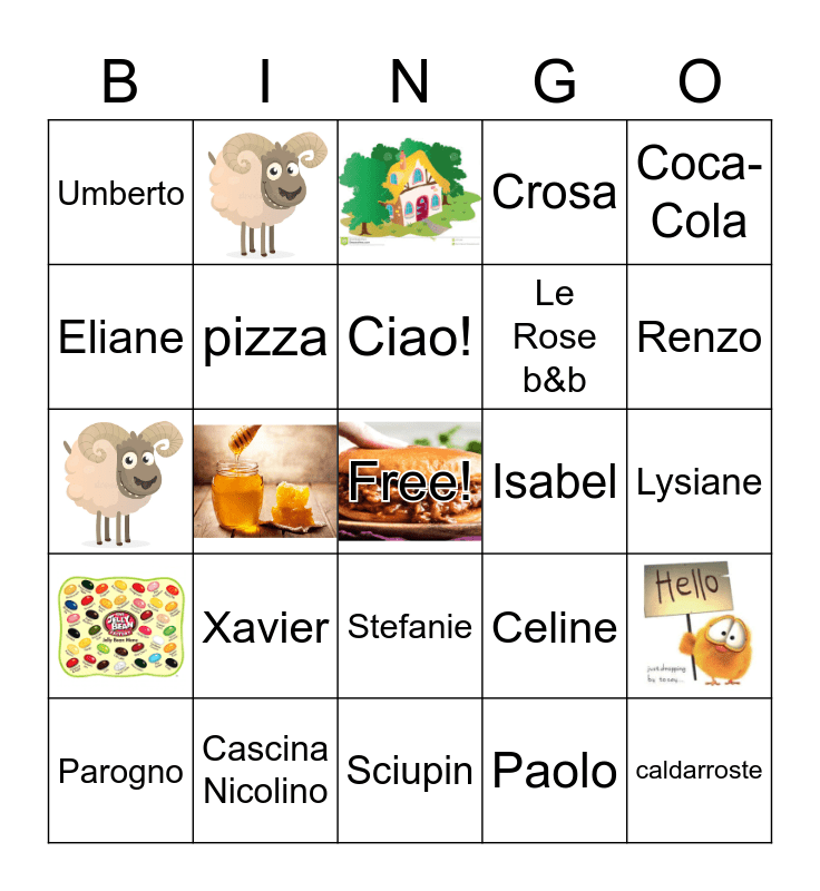 This bingo card has 8 images, a free space and 21 words: Parogno, San Pancrazio, Umberto, pizza, Xavier, Isabel, Cascina Nicolino, Lysiane, caldarroste, Sciupin, Paolo, Renzo, Freisa, Stefanie, Coca-Cola, Celine, Lola, Le Rose b&b, Eliane, Crosa and Ciao!.