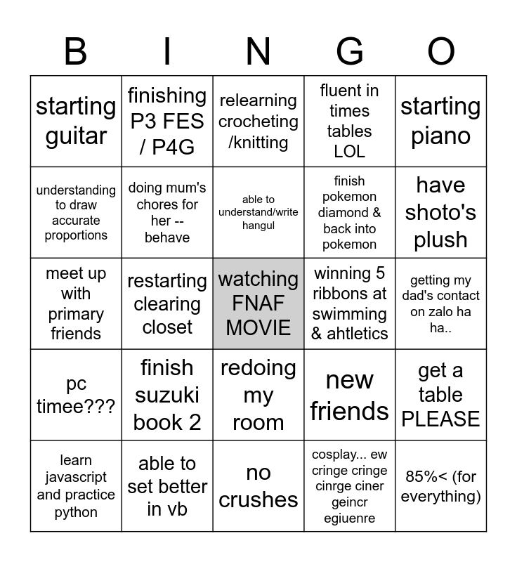 This bingo card has a free space and 24 words: finish suzuki book 2, able to set better in vb, able to understand/write hangul, learn javascript and practice python, starting piano, starting guitar, understanding to draw accurate proportions, finishing P3 FES / P4G, winning 5 ribbons at swimming & ahtletics, redoing my room, finish pokemon diamond & back into pokemon, meet up with primary friends, new friends, get a table PLEASE, doing mum's chores for her -- behave, cosplay... ew cringe cringe cinrge ciner geincr egiuenre, getting my dad's contact on zalo ha ha.., relearning crocheting /knitting, have shoto's plush, restarting clearing closet, 85%< (for everything), pc timee???, fluent in times tables LOL and no crushes.