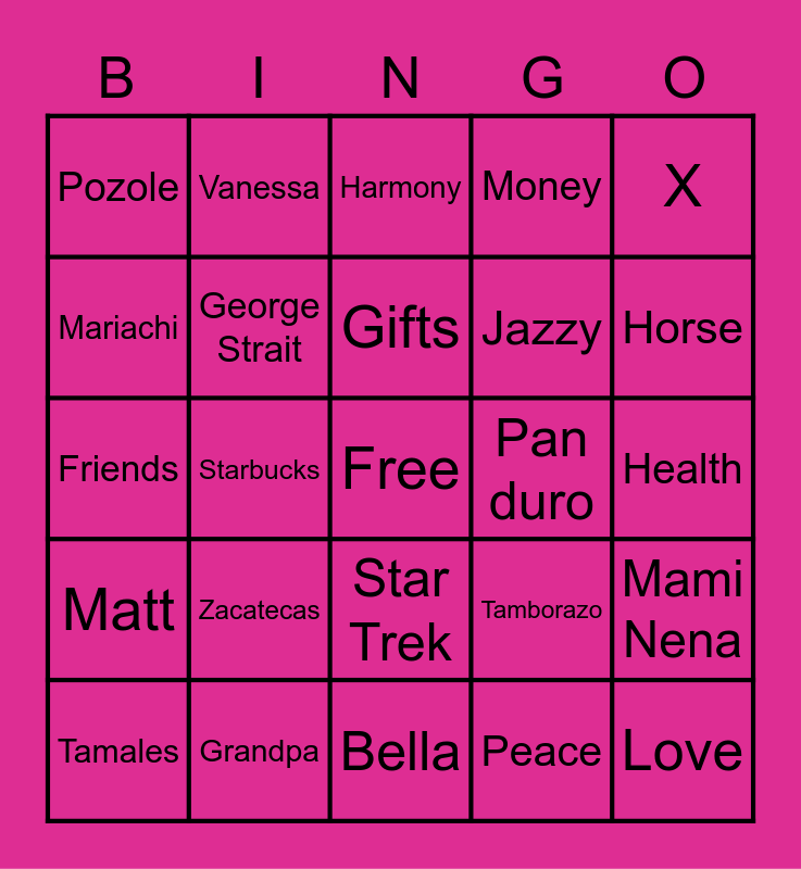 This bingo card has a free space and 24 words: Zacatecas, Grandpa, Gifts, Tamales, X, Pozole, Mariachi, Vanessa, Pan duro, Star Trek, Jazzy, Friends, Tamborazo, Mami Nena, George Strait, Peace, Health, Harmony, Horse, Starbucks, Love, Matt, Money and Bella.