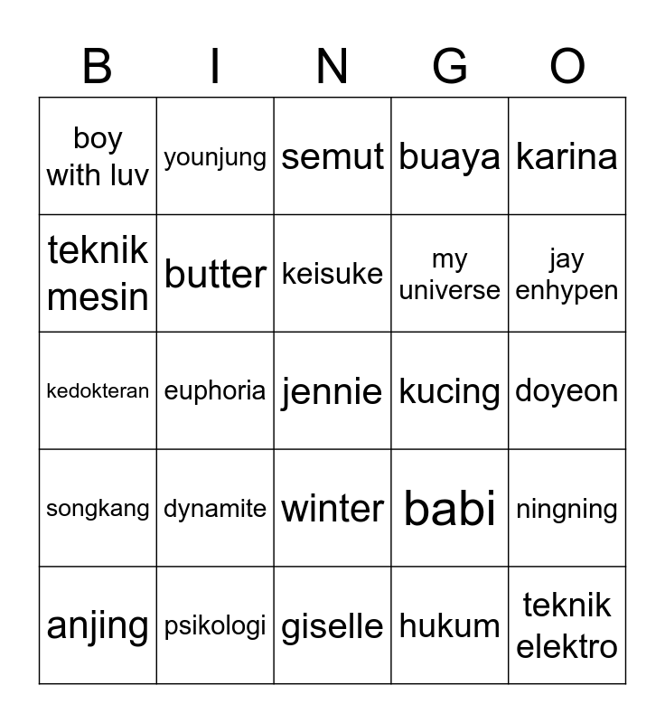 This bingo card has a free space and 24 words: dynamite, psikologi, keisuke, anjing, karina, boy with luv, teknik mesin, younjung, kucing, winter, my universe, kedokteran, babi, ningning, butter, hukum, doyeon, semut, jay enhypen, euphoria, teknik elektro, songkang, buaya and giselle.