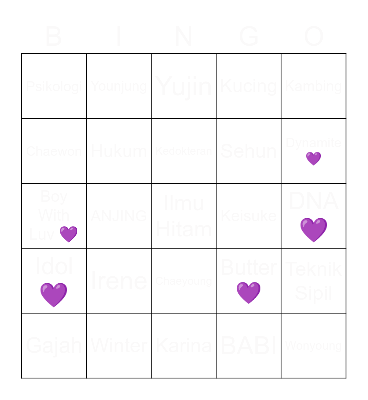 This bingo card has a free space and 24 words: Irene, Winter, Kedokteran, Gajah, Kambing, Psikologi, Chaewon, Younjung, Keisuke, Chaeyoung, Sehun, Boy With Luv 💜, Butter💜, Teknik Sipil, Hukum, BABI, DNA💜, Yujin, Dynamite 💜, ANJING, Wonyoung, Idol💜, Kucing and Karina.