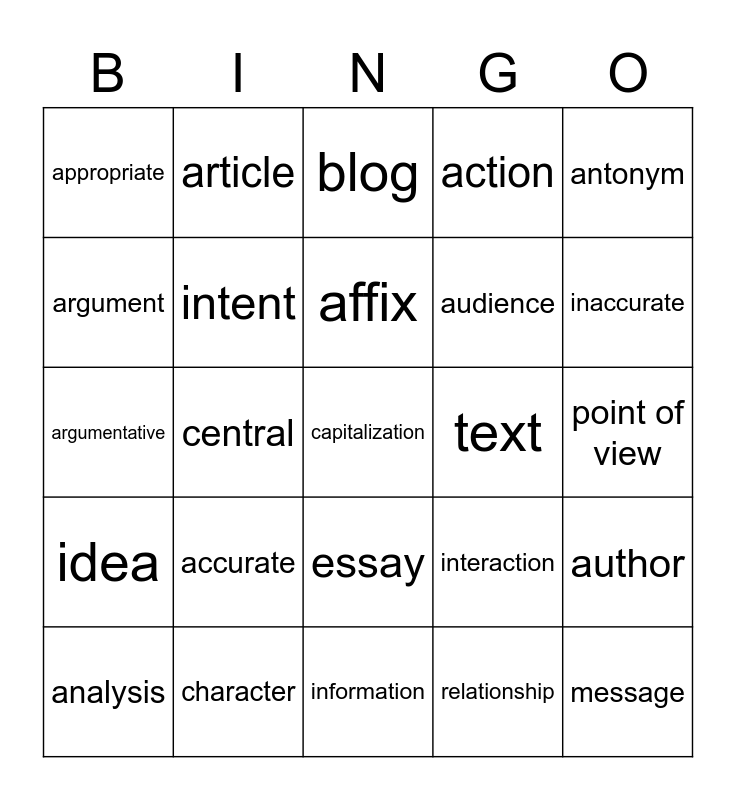 This bingo card has 25 words: accurate, information, affix, analysis, antonym, appropriate, argument, article, text, essay, audience, argumentative, interaction, author, intent, message, point of view, blog, inaccurate, central, capitalization, character, idea, action and relationship.
