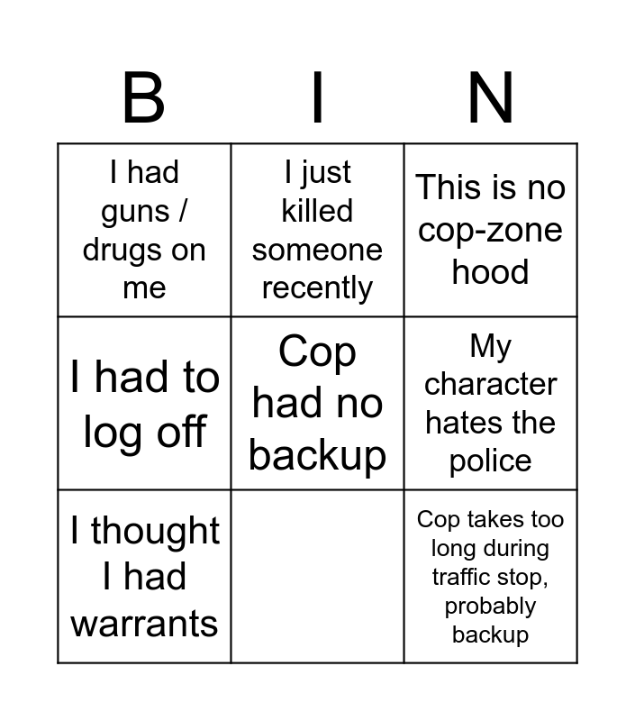 This bingo card has 9 words: I thought I had warrants, I just killed someone recently, My character hates the police, I had guns / drugs on me, This is no cop-zone hood, I had to log off, Cop had no backup, Cop takes too long during traffic stop, probably backup and They asked for it.