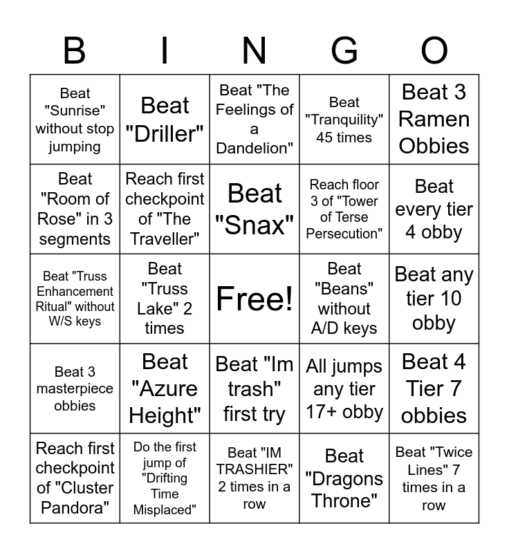 This bingo card has a free space and 24 words: Reach first checkpoint of "Cluster Pandora", Beat "Azure Height", Beat "Snax", Beat "Dragons Throne", Beat 3 Ramen Obbies, Beat "Sunrise" without stop jumping, Beat "Driller", Beat "The Feelings of a Dandelion", Beat "Beans" without A/D keys, Beat any tier 10 obby, Beat "Truss Enhancement Ritual" without W/S keys, Reach first checkpoint of "The Traveller", All jumps any tier 17+ obby, Beat 4 Tier 7 obbies, Beat "Room of Rose" in 3 segments, Do the first jump of "Drifting Time Misplaced", Beat "IM TRASHIER" 2 times in a row, Beat "Tranquility" 45 times, Beat every tier 4 obby, Beat 3 masterpiece obbies, Beat "Truss Lake" 2 times, Beat "Im trash" first try, Reach floor 3 of "Tower of Terse Persecution" and Beat "Twice Lines" 7 times in a row.