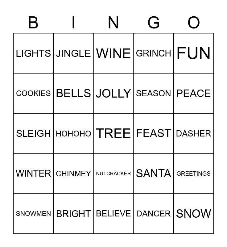 This bingo card has 75 words: MERRY, SOLTICE, WINE, CAROLS, CHRISTMAS, FESTIVE, YULE, HOLLY, REINDEER, FRSTY, SNOW, LVE, JOLLY, COOKIES, GINGERBREAD, HOHOHO, ANGEL, TREE, GIFT, FUN, TOYS, SLEIGH, BELLS, JINGLE, GRINCH, HOPE, PRESENT, FAMILY, JOYFUL, CHEER, ELF, NOEL, NORTHPOLE, SANTA, PEACE, SEASON, REJOICE, CUPID, DASHER, DANCER, BLITZEN, PRANCER, VIXEN, COMET, DONNER, ORNAMENTS, SNOWMEN, LIGHTS, COZY, FIRE, DECORATE, NUTCRACKER, MISTLETOE, STAR, BOW, WREATH, RUDOLPH, STOCKING, CARDS, CANDY CANE, CHINMEY, PINECONE, SAINT NICK, LOBSTAH, CLAMS, FEAST, HOLIDAY, SCROOGE, CHESTNUTS, GREETINGS, WINTER, BRIGHT, COCOA, BELIEVE and EGGNOG.