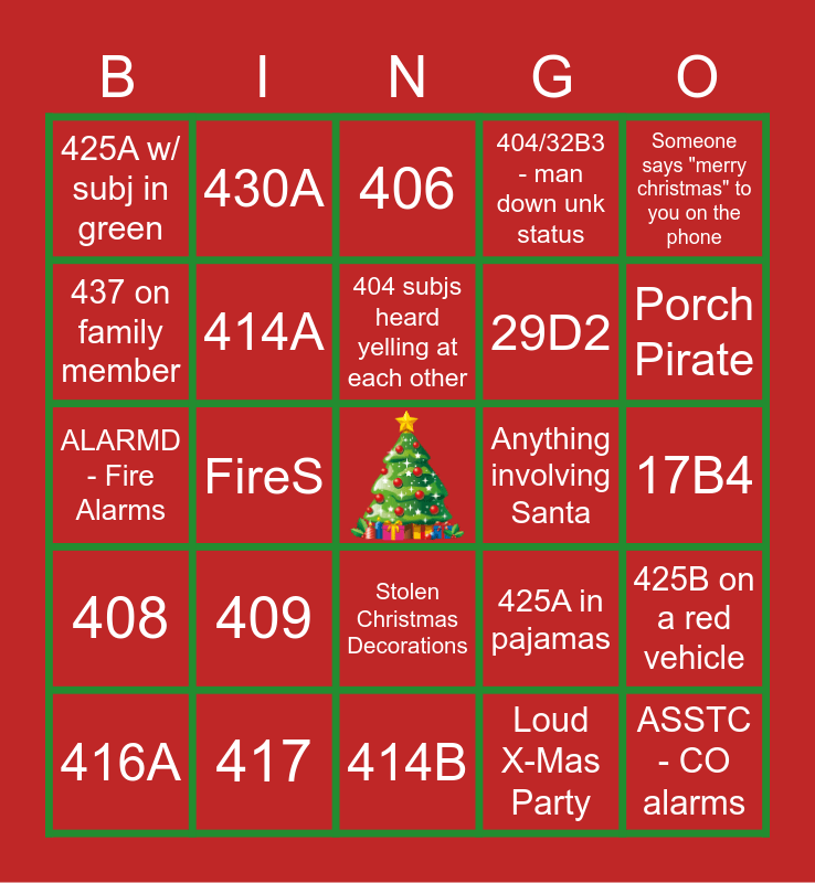 This bingo card has a free space and 30 words: 417, 415D, FireS, FireB, 425A w/ subj in green, 406, 414A, Stolen Christmas Decorations, Anything involving Santa, 414B, 17B4, ASSTC - CO alarms, Loud X-Mas Party, FireP (contained oven fire), Porch Pirate, Mailboxes broken into, 425A in pajamas, 408, 409, Someone says "merry christmas" to you on the phone, ALARMD - Fire Alarms, Fight w/ LP @ store (407), 430A, 29D2, 437 on family member, 404/32B3 - man down unk status, 425B on a red vehicle, 416A, 404 subjs heard yelling at each other and 32B2 - Med Pendant Alarm.